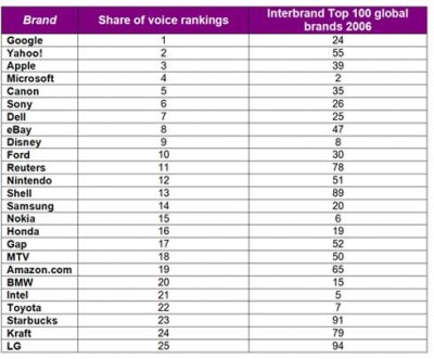 De onderzoekers hebben de resultaten van de merkvermeldingen vergeleken met de lijst van de Interbrand Top 100. Dat levert het volgende resultaat op: