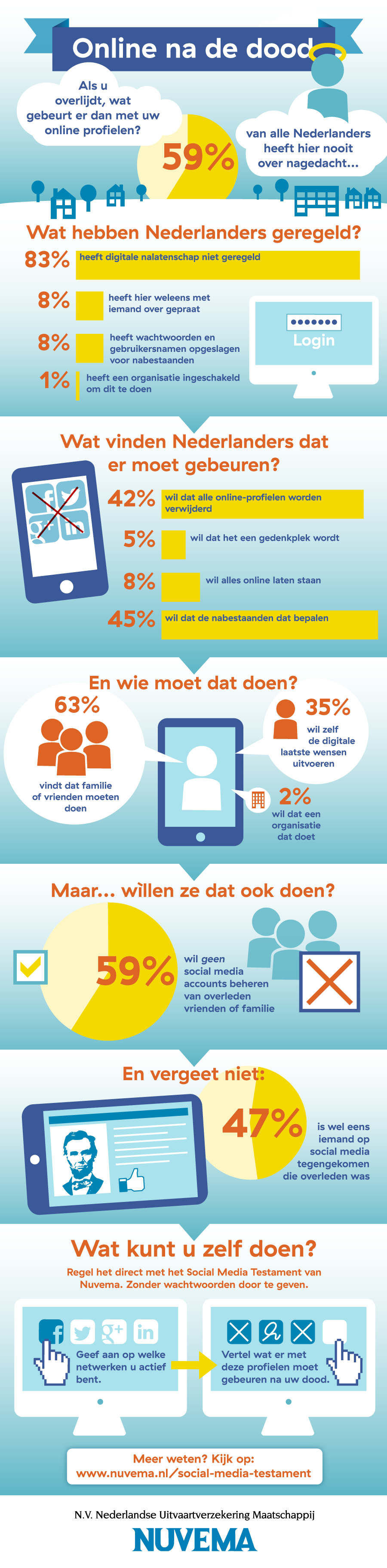 In het onderzoek van Nuvema, uitgevoerd door Multiscope onder 1000 Nederlanders, werd onder meer gevraagd naar wat men zou willen dat er met hun sociale media gebeurt na hun overlijden. Bijna de helft wil die keuze aan nabestaanden overlaten. Andersom zou ruim de helft van de nabestaanden juist niet belast willen worden met het beheer van sociale media wanneer een vriend of familielid komt te overlijden. Dit kan leiden tot een potentieel lastige situatie, helemaal als je bedenkt dat bijna tweederde nog nooit over dit onderwerp heeft nagedacht.