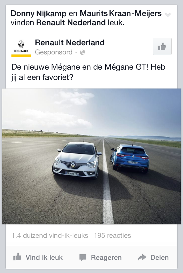 Maar overleden personen kunnen ook een concreet probleem vormen voor je organisatie als je adverteert op de doelgroep: ‘Vrienden van personen die je pagina leuk vinden’. Want als je vriend Donny of Maurits is overleden, dan is zo’n aanbeveling voor Renault natuurlijk wel een beetje raar. Maurits vindt niks meer leuk, hij kan helaas niks meer leuk vinden. Als je als organisatie gebruik maakt van je vrienden en een “over hun rug”-campagne voert dan kan je de plank wel eens mis slaan. Helemaal als de dood van Donny een gevolg is van een auto-ongeluk.