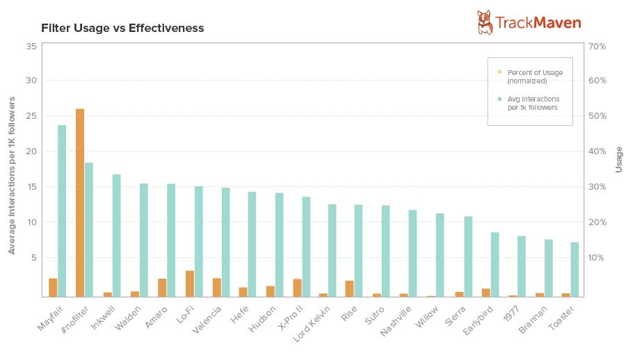 De meest gebruikte filter is… geen filter. Gemiddeld kunnen foto’s met de Mayfair-filter echter op de meeste interactie rekenen. Zwart-wit filters worden beduidend minder gewaardeerd.