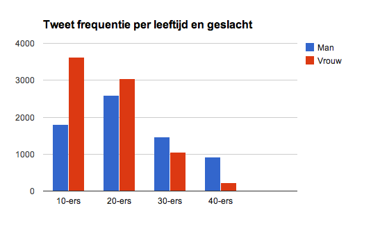 Er bestaat een groot verschil in activiteit tussen de verschillende leeftijdsgroepen. De gemiddelde tiener heeft zo’n 3.000 tweets, daar waar de oudere gebruiker gemiddeld 1.000 tweets heeft geplaatst. Wat ook erg opvallend is, is dat de vrouwelijke tieners opvallend veel actiever zijn dan de mannen.