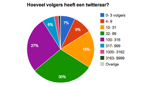 Kijken we naar het aantal volgers, dan is de verdeling erg scheef. Slechts 3 procent van de Nederlandse twitteraars heeft meer dan 1.000 volgers. De gemiddelde Nederlandse twitteraar heeft 47 volgers en volgt zelf 89 anderen.
