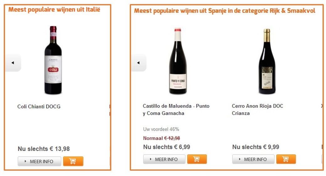 Verschil in personalisatie op de website. De linker afbeelding toont de aanbeveling voor iemand die geïnteresseerd is Italiaanse wijnen. Rechts zijn de aanbevelingen getoond voor iemand die geïnteresseerd is in rijke & smaakvolle Spaanse wijnen onder de €10.