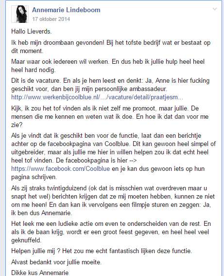 Ik verwachtte een stuk of tien, misschien na een kleine week vijftien, kleine berichtjes met iets in de trant van “Voor die vacature moeten jullie Annemarie hebben”. Maar in plaats daarvan krijg ik alleen al op vrijdag 25 uitgebreide aanbevelingen waarom ik de geschikte kandidaat zal zijn voor de functie. Hieronder zie je een selectie van de leukste.