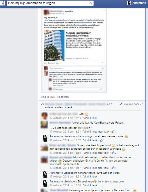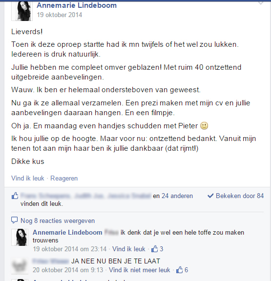 En zo start ik vrijdagochtend met het oprichten van de geheime Facebookgroep ‘Help mij mijn droombaan te krijgen’. Erin zitten mensen die óf vanuit zakelijk perspectief, óf vanuit vrienden, óf vanuit mijn netwerk komen. Een mooi mengelmoesje van potentiële ambassadeurs. Om elf uur ’s ochtends start ik met de oproep.