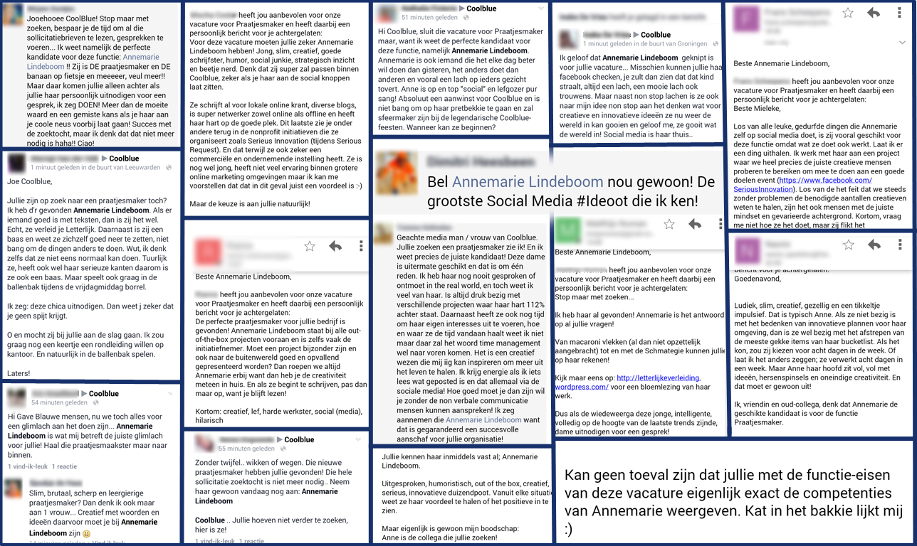 De webcare van het bedrijf waar je wilt werken laten spammen met generieke berichten van anderen over hoe geweldig je bent, inderdaad een zéér goede strategie.