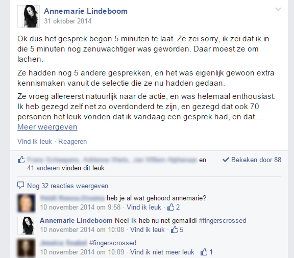 Het gaat goed. We hebben een vrij ongedwongen gesprek, waarin ze vertelt hoe leuk ze de actie vindt en meteen vraagt of er ook allemaal mensen voor de deur komen staan als zij mij niet aannemen. Ik antwoord hierop dat ik niet voor de gevolgen kan in staan. We bespreken nog wat meer en het hele verhaal van het gesprek deel ik natuurlijk opnieuw in de groep.