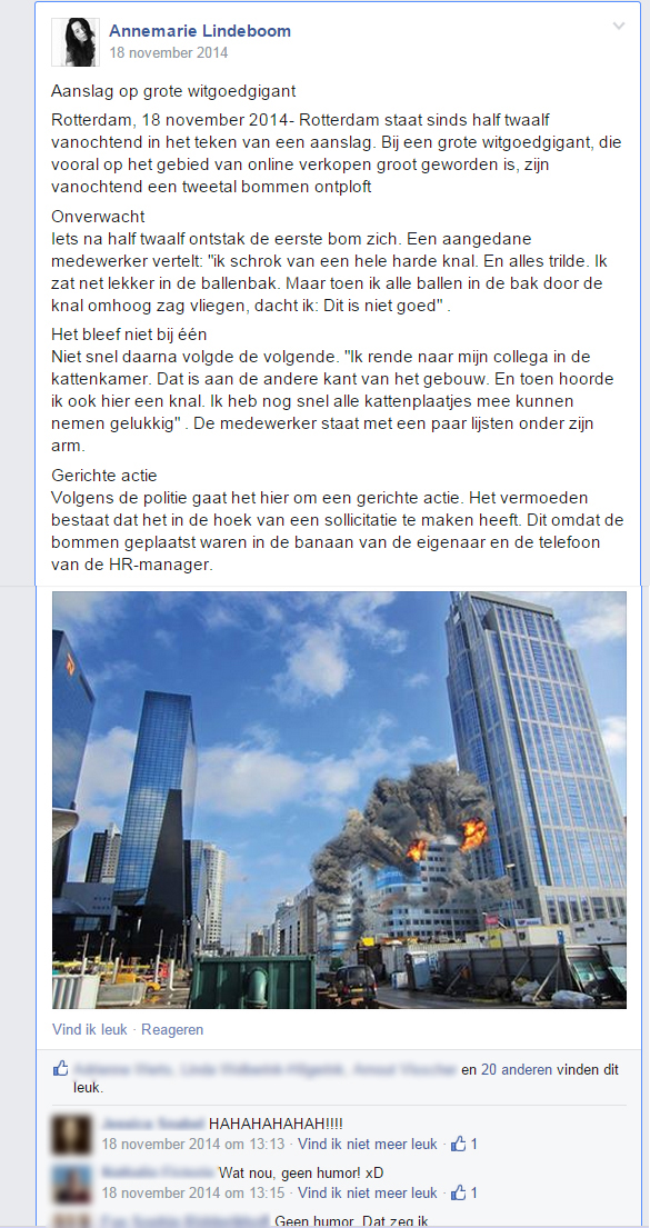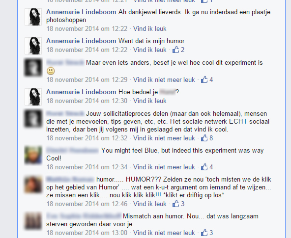 De Facebook-groep ontploft. Echt, binnen tien minuten, alsof ze allemaal zaten te wachten op de uitslag. Iedereen vindt het belachelijk en steunt mij. Er worden filmpjes van onder andere Jiskefet gedeeld over wat humor is en Coolblue heeft hierna een paar fans minder. Het is hartverwarmend om al de reacties te lezen en ik merk dat hierdoor de uitslag voor mij minder belangrijk wordt. Want dit, dit experiment en deze mensen, dit is eigenlijk wel heel mooi.