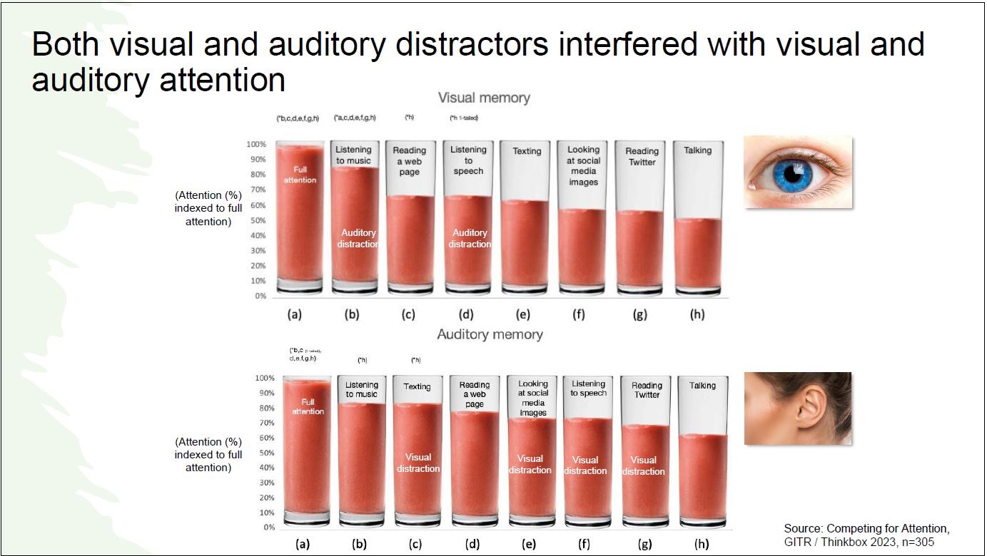 In de onderstaand figuur worden de verschillende activiteiten gerangschikt qua volgorde waarin ze het visuele en auditieve geheugen het minst beperkten. Voor het visuele geheugen zijn ‘naar muziek luisteren’, ‘een webpagina lezen’ en ‘naar een gesprek luisteren’ achtereenvolgens het minst belastend en ‘met iemand anders praten in dezelfde ruimte’, het meest belastend. Voor het auditieve geheugen zijn ‘naar muziek luisteren’, ’texten’ en ‘een webpagina lezen’ achtereenvolgens het minst belastend en eveneens met iemand anders praten in dezelfde ruimte, het meest.