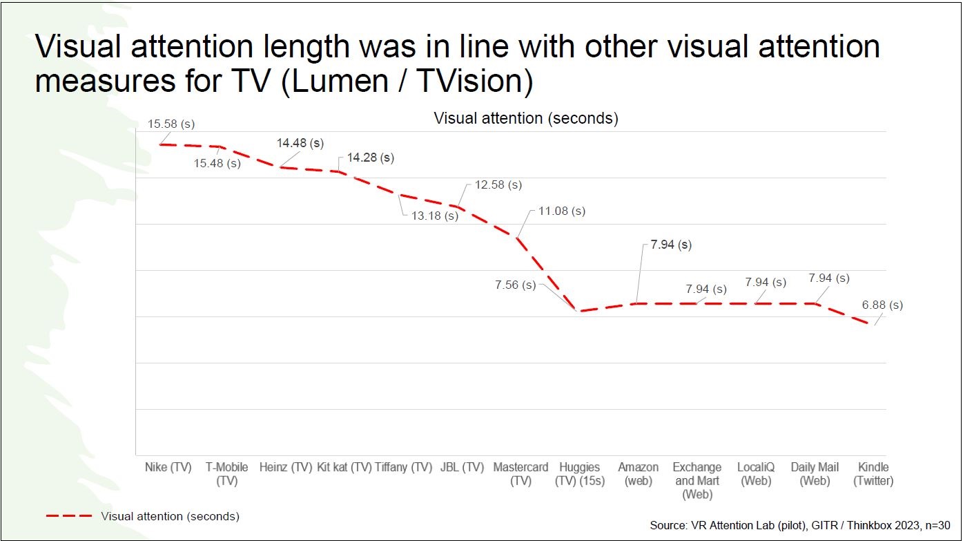 In het vervolgonderzoek worden in een Virtual Reality-experiment verschillende commercials vertoond op een groot tv-scherm of op een klein iPad-scherm. Op het grote scherm werden commercials vertoond en op het iPad-scherm zowel afleidingsboodschappen als videoreclames in een social media omgeving. In de onderstaande figuur wordt de hoeveelheid visuele aandacht in seconden weergegeven voor de verschillende commercials. Qua aantal seconden scoort de Nike tv-commercial het beste (gemiddeld 16 seconden) en de Kindle commercial op Twitter het slechtste (gemiddeld 7 seconden). De gevonden aandachtresultaten waren vergelijkbaar met die uit andere onderzoeken zoals het Lumen/TVision onderzoek.