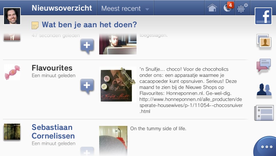 De website van Facebook wordt met de dag slechter en onoverzichtelijker, met als toppunt de nieuwe tijdslijn. Allerlei reclame, enorm veel menu’s en overal weer kleine submenu’s met opties waarvan je niet weet of je het aan of uit moet zetten. Facebook is daardoor bij uitstek het platform voor een app, waarbij je zelf kan bepalen wat je wel en wat je niet te zien krijgt. Ook hier heeft SONY het begrepen, wat een verademing: Bovenaan zie je waar je bent in Facebook, rechts duidelijk de iconen waar je naartoe kan en middenin de berichten. Overduidelijk, het is haast geen facebook meer.