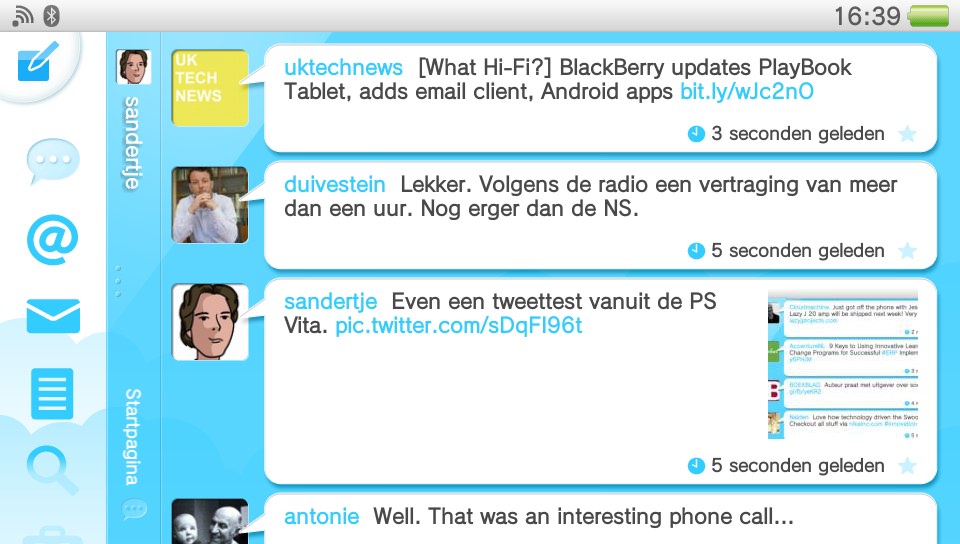 Livetweet is de naam van de twitter app van SONY. Het lijkt erg op de basis app van Twitter zelf, voorheen Tweetie. Alle basisfuncties zijn aanwezig. Linksboven (normaal geen goeie plek, maar aangezien je in landschapmodus zit, de plek om met je duim een nieuwe tweet te beginnen) het icoontje voor het schrijven van een nieuwe tweet. Daaronder je tijdslijn, conversaties, direct messages en een zoekfunctie. Rechts alle tweets van je tijdslijn, er hadden er misschien wat meer op één scherm gepast, maar de verhoudingen lijken toch wel te kloppen. Het bekijken van profielen en reageren op tweets verloopt zo soepel, wat dit een ideale app voor alledaags gebruik maakt. Voor het heavy werk met verschillende lists en accounts moet je hier niet zijn en wat mij betreft houdt SONY de app lekker simpel.