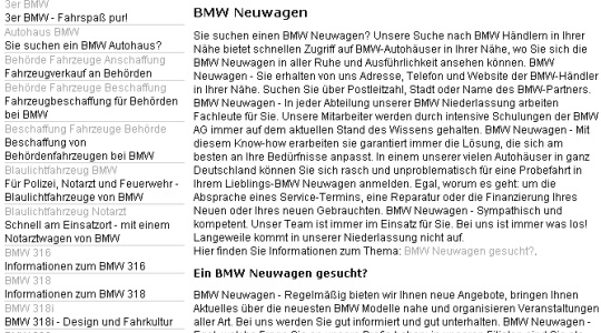Op 4 februari 2006 ging BMW in Duitsland op het strafbankje: het hele domein werd uit Google gezet. Matt Cutts maakte er een flink punt van en schreef er een blog over met screenshots. Het was een klassiek voorbeeld van JavaScript-cloaking, waarbij de zoekmachines automatisch gegenereerde content vol keywords te zien kregen en bezoekers de ‘gewone’ site. Deze spam heeft ongeveer een jaar online gestaan, de penalty duurde 5 dagen.