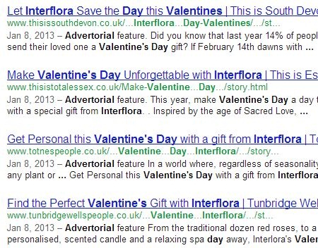 Een aantal weken geleden ging het mis bij Interflora in de UK. In de aanloop naar Valentijn kochten ze in korte tijd meer dan 150 advertorials op allerlei regionale nieuwssites. Die advertorials waren bedoeld om meer linkwaarde op de relevante keywords (valentines, flowers, e.d.) te krijgen. Daarmee ‘kocht’ Interfora dus een goede positie in Google en daarmee verdienden ze rond Valentijn veel geld. De penalty volgde pas na Valentijn en duurde 11 dagen. Daarna was Interflora weer terug in Google.
