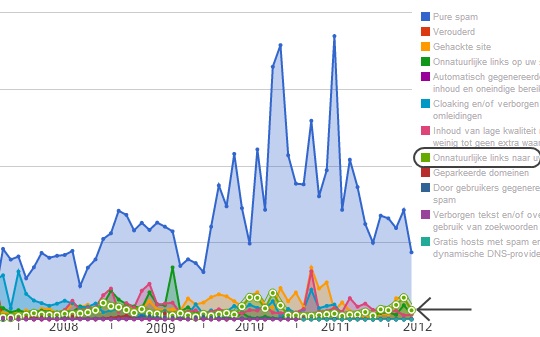 De categorie “onnatuurlijke links naar uw site” ligt een stuk lager: zo’n 20.000 per maand. Een schijntje ten opzichte van het totaal. Hierbij moet gezegd worden dat de data die Google hier geeft ongeveer een jaar achterlopen. Het kan dus zijn dat ze inmiddels meer off-page-spam filteren. Desalniettemin kan ik op basis van deze data alleen maar concluderen dat Google nauwelijks optreedt tegen linkspam. De data die Google zelf geeft, onderschrijft dus de stelling dat off-page-spam in veel gevallen niet zal worden gepakt.