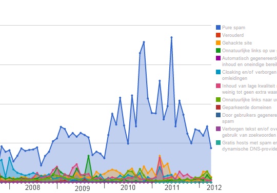 Wat het meest opvalt aan de grafiek, is dat het overgrote deel (zo’n 250.000 per maand) van de handmatig gefilterde spam valt in de categorie “pure spam”. Google definieert dat als volgt: “automatically generated gibberish, cloaking and scraping content from other websites”. Allemaal on-page-spam dus.