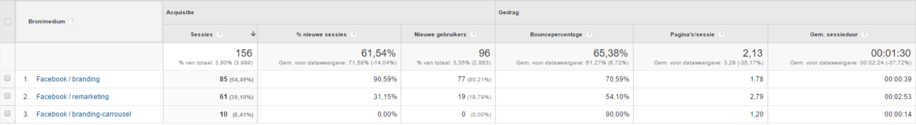 Hier zie je de gegevens van Facebook al opgesplitst naar de drie mediums die we gebruikt hebben in plaats van dat alles op de campagnenaam Facebook terecht komt. Wanneer we doorklikken op Facebook/branding-carrousel kunnen we de gegevens van alleen de Facebook carrousel zien.