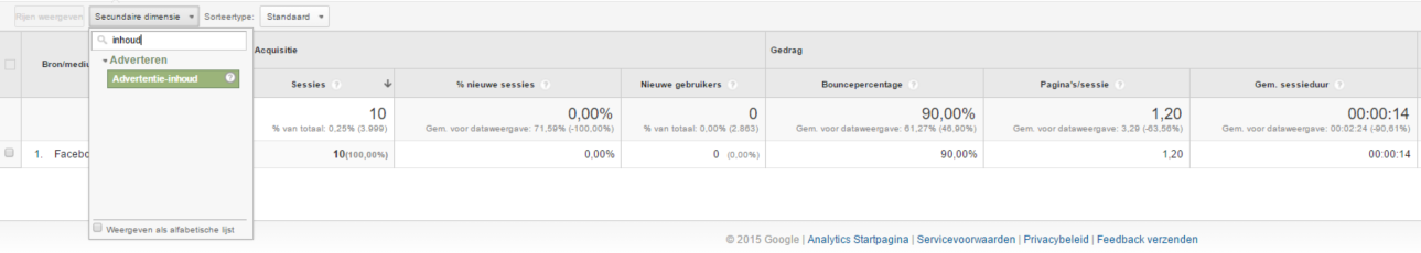 Het enige wat je op dit niveau nog moet doen is aangeven dat je de secundaire dimensie ‘Advertentie-inhoud’ (content in de UTM-code) wilt tonen.