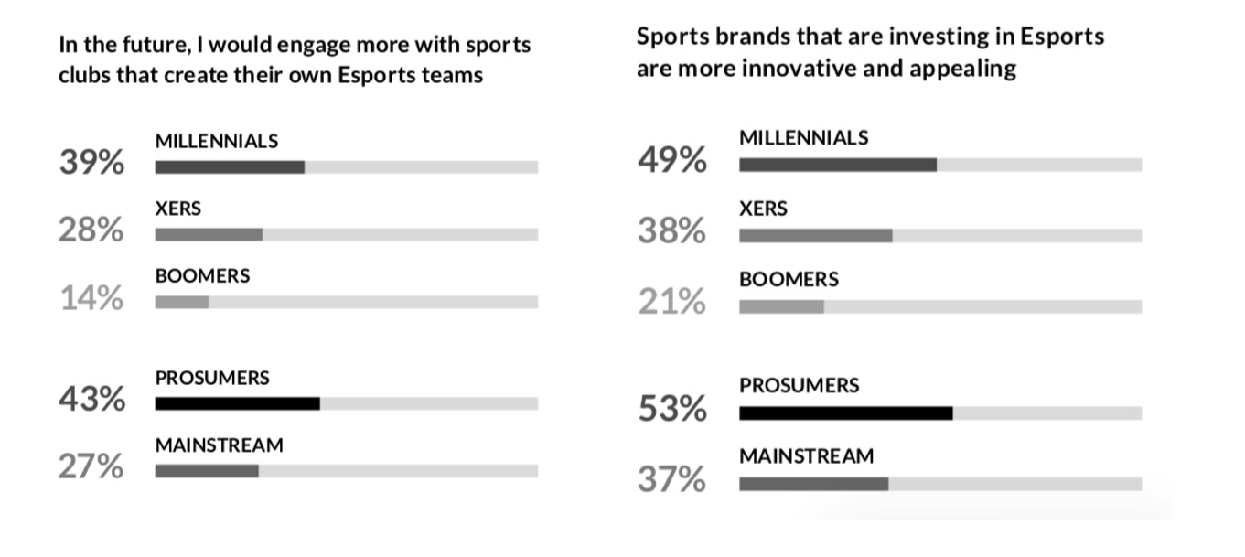 Naast fysieke sport worden e-sports steeds populairder. De opbrengsten in de game-industrie worden steeds hoger en daarmee het aanzien van de spelers. Zes op de tien prosumers geven aan dat ze trots zouden zijn als een van hun kinderen eSports-kampioen zou worden. De meeste succesvolle gamers winnen dan ook miljoenen aan prijzengeld. De Nederlandse Dave Jong bijvoorbeeld won 1,1 miljoen dollar toen hij tweede werd op het WK Fortnite in 2019. Om jonge generaties aan te trekken zouden sportmerken e-sport moeten incorporeren. Zo zouden bijna vier op de tien millennials zich meer bezighouden met sportclubs als ze eigen e-sportteams zouden hebben. En vindt bijna de helft van hen dat merken die investeren in e-sport aantrekkelijker en innovatiever zijn. Beide stellingen zijn ook zeer populair in China, in India en onder prosumers.