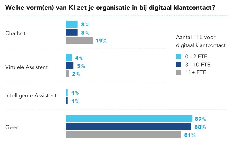 Het aantal organisaties dat in het onderzoek aangeeft KI in te zetten in digitaal klantcontact is in 2018 (nog steeds) relatief klein. Organisaties die wel gebruik maken van KI zetten vooral chatbots in. Dit zijn overwegend de grote organisaties (11+ fte voor digitaal klantcontact). Zij zetten KI vooral in op de eigen website (en in de app), LiveChat en Facebook Messenger. Veel – ook kleine – organisaties geven wel aan de inzet van KI voor de (nabije) toekomst te overwegen.