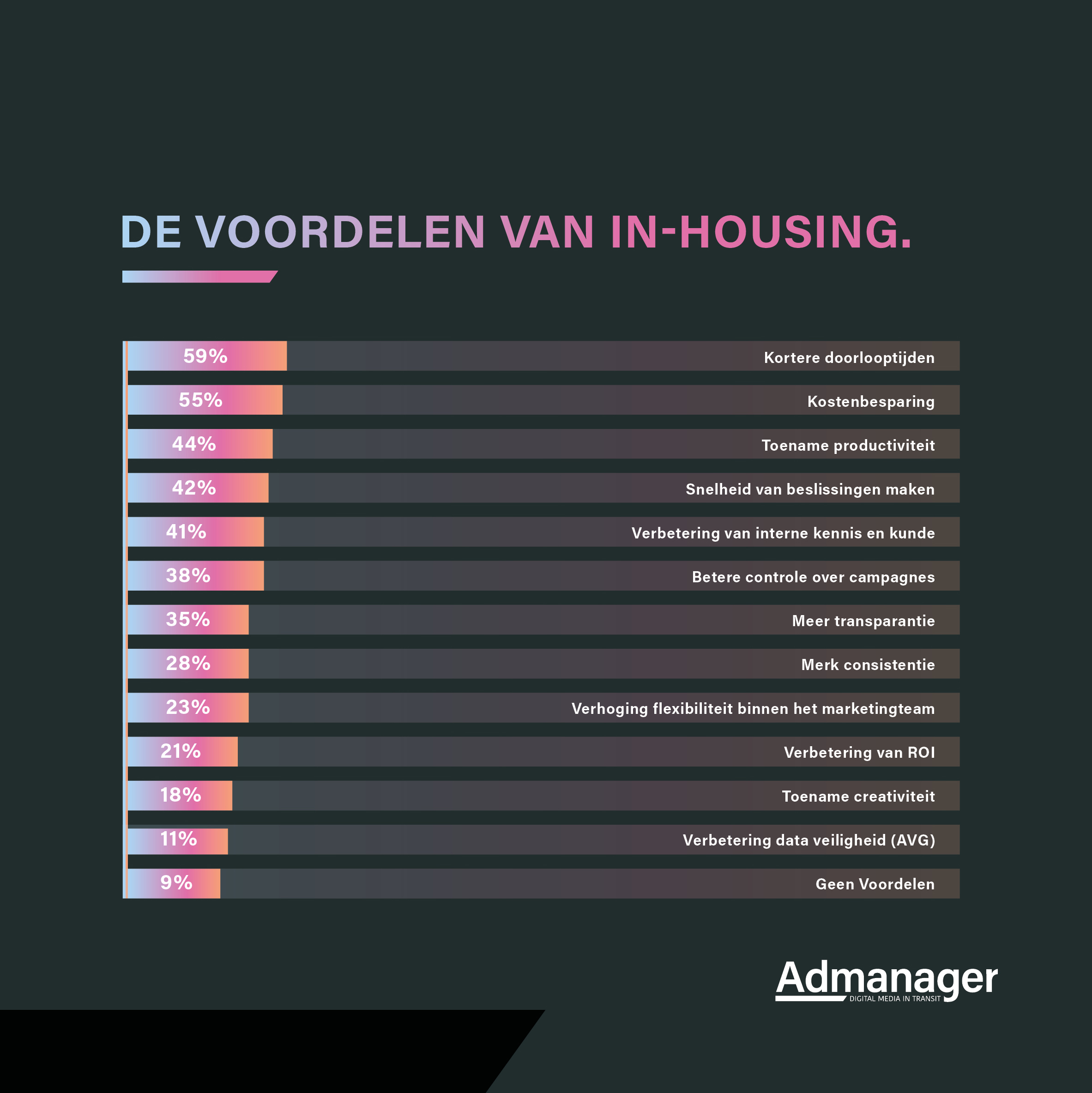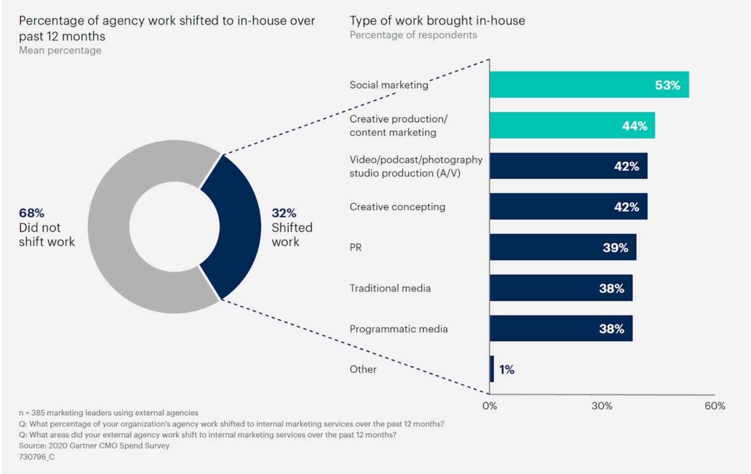 Het in-housen van de digitale marketingoperatie blijft een hot item voor adverteerders. Uit de CMO Spent Survey (2020) van Gartner blijkt dat in de afgelopen twaalf maanden gemiddeld 32 procent van de CMO’s normaliter uitbestede activiteiten hebben geïntegreerd binnen de eigen marketingorganisatie. 53 procent integreerde social, 44 procent creatie en 38 procent maakte de overstap om traditionele media en programmatic zelf uit te voeren.