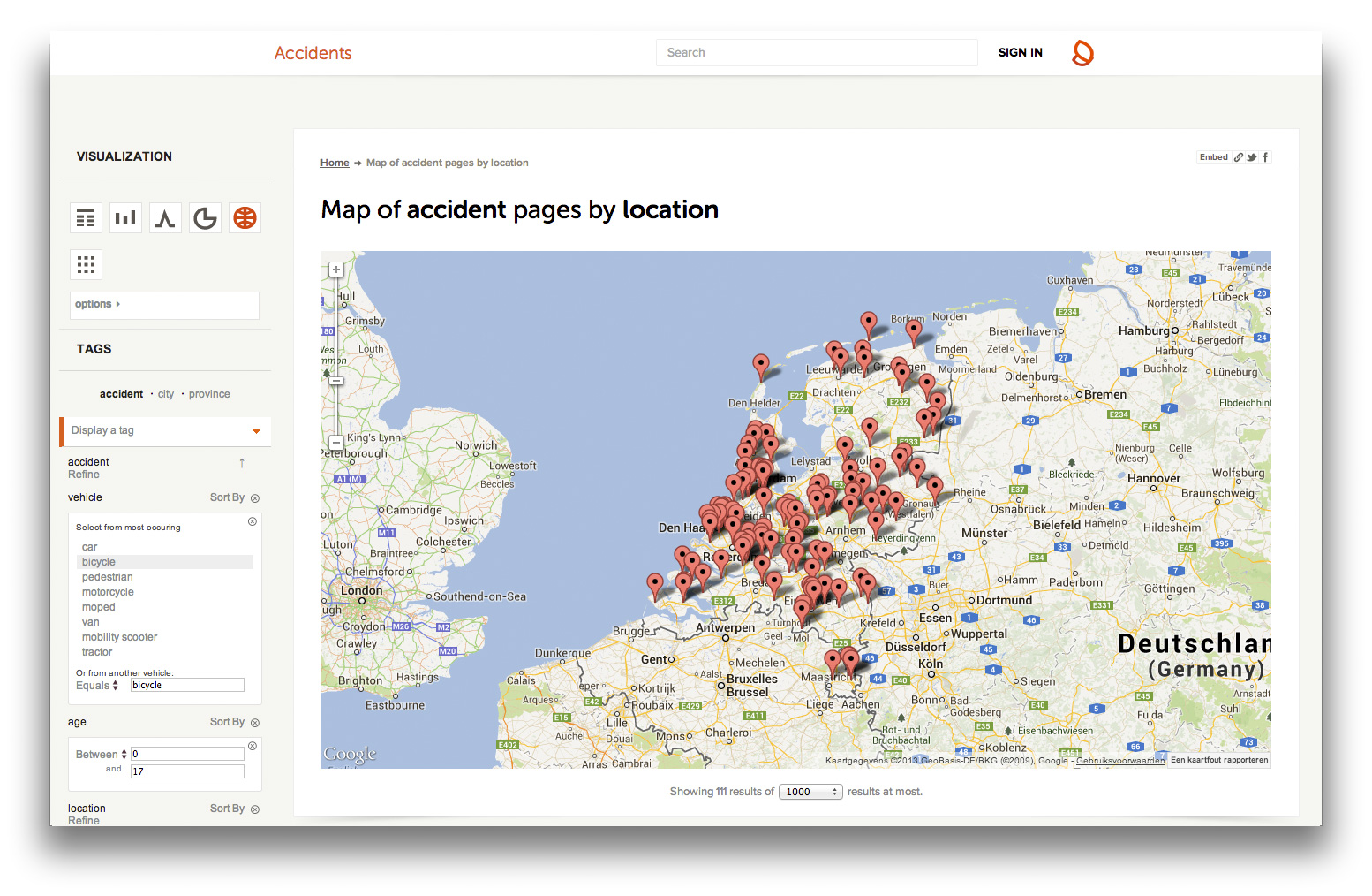 Visualisatie van verongelukte fietsende kinderen in het verkeer (bron: http://accidents.silkapp.com/)