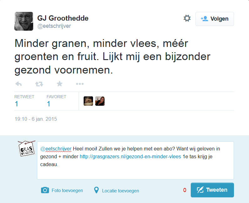 Met een beetje geluk zien de 5.700 volgers van @Eetschrijver jouw bericht en volgen ook de link naar jouw blog. Nadeel is dat je mensen vanaf je blog weer moet leiden naar het daadwerkelijke conversiepunt. Maar he, dat kan jij.