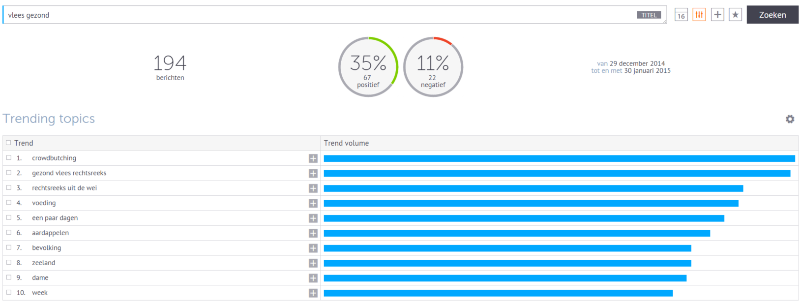 Wat het berekenen van de Share of Voice betreft: ik zou zelf gaan voor het ‘bereik’ in plaats van ‘aantal berichten’. Je kunt beter iemand met 2000 volgers hebben die je bericht deelt of over je praat, dan 10 mensen met elk een handvol volgers. Wat vind jij?