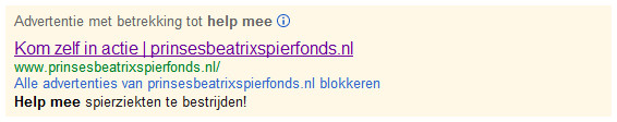 Voorbeeld 2. Help mee. Spierziekten moeten bestreden worden. Dit kan via het Beatrixfonds.