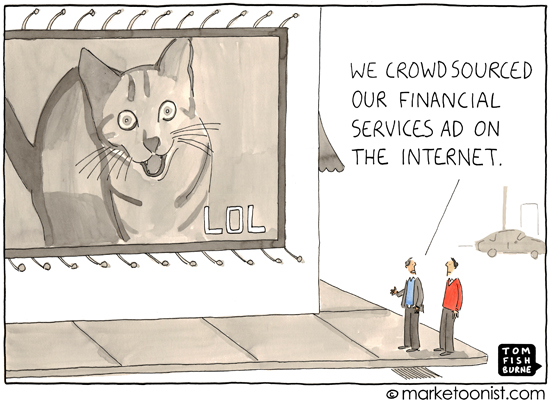 Marketoonist Tom Fishburn publiceerde laatst een cartoon over lolcats (grappige afbeeldingen of videos van katten). Dit is wat je krijgt als je de gemiddelde webbezoeker vraagt wat hij het liefste ziet. De cartoon van Fishburn wijst ons op de keerzijde van zelflerende optimalisatie. Met dit algoritme wordt je online koers namelijk bepaald door de mening van de massa. Wisdom of the crowds is dus alleen waardevol als je de juiste groep mensen raadpleegt en zo optimaliseert voor relevantie in plaats van voor ‘gemiddeldheid’.