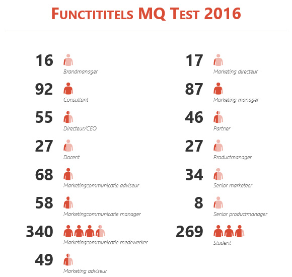 In totaal deden bijna 1.200 professionals mee via www.nationalemqtest.nl. De meeste deelnemers waren afkomstig uit de branche Communicatie & Media. Opvallend is het grote aantal studenten dat aan de test deelnam, terwijl ook consultants, marketingmanagers en marcomprofs goed vertegenwoordigd zijn.