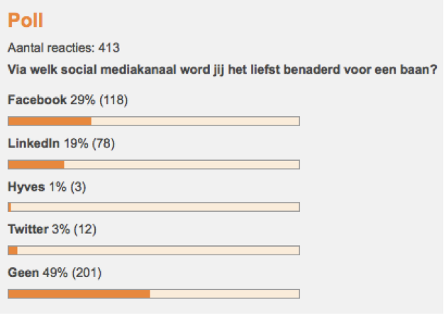 Het grootste gedeelte van studenten en starters zit op Facebook. Waarmee niet gezegd kan worden dat je ze ook daar moet werven. Want hoe staan jongeren tegenover recruitment via sociale media? Onderzoek uit 2011 wees al uit dat 50% van de jongeren niet zit te wachten op recruitment via social media. Hetzelfde onderzoek,dat deze maand opnieuw is gehouden, laat weinig verandering zien. Wel is duidelijk dat de overige 51% vooral open staat voor recruiters op zowel Facebook (29%) als LinkedIn (19). En aangezien actief werven alleen zin heeft als men er ook voor open staat, kunnen we dan stellen dat Hyves en Twitter bij deze niet het juiste medium zijn voor onze twintigers?