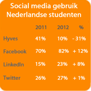 We wisten het misschien al wel toen we de laatste social media statistieken van Newcom binnenkregen, maar onderzoek onder 1200 Nederlandse studenten en starters bevestigt dat zij het afgelopen jaar massaal Hyves aan de kant hebben geschoven. Gaf in 2011 nog 41% aan actief op Hyves te zitten, nu is dit percentage geslonken naar een schamele 10%. Met deze keldering behoren studenten en starters voorgoed niet langer tot de doelgroep van Hyves. 82% van de respondenten beschikt over een Facebook account. Het aantal gebruikers van dit medium groeide 12% ten opzichte van 2011. Ook LinkedIn maakt een duidelijke groei door, met een stijging van 8% is het percentage actieve gebruikers uitgekomen op 23%. Deze groei wordt voornamelijk veroorzaakt door een toename van gemiddeld 300% onder het aantal 20- en 21-jarigen ten opzichte van 2011. Het Twittergebruik van de studenten is met 27% nagenoeg gelijk gebleven.