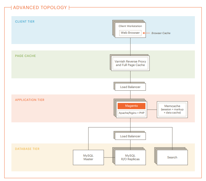 In bovenstaand model is te zien hoe de Magento-structuur is opgebouwd, verdeeld in vier delen die geoptimaliseerd zijn voor performance en schaalbaarheid.