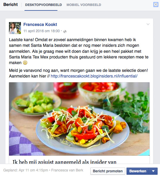Alle uitwerkingen werden gedeeld met de hashtag #verrasmettexmex, zodat je via sociale media gemakkelijk kon doorklikken naar andere recepten. De insiders konden ook nog wat winnen: de beste recepten werden beloond met een Santa Maria BBQ-pakket. De drie influencers plaatsten gedurende de campagne tussentijds een artikel met nieuwe recepten en sloten de actie af met de bekendmaking van de winnaars.