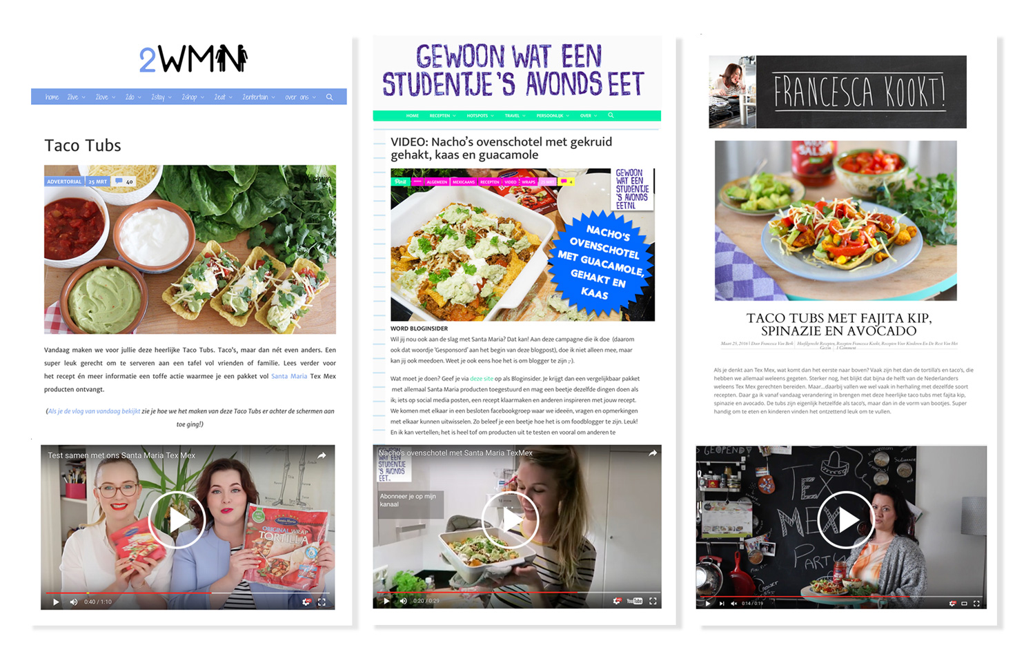 Met behulp van een campagne wilde Santa Maria de Mexicaanse keuken op de kaart zetten en vooral vrouwen (de boodschappers) inspireren. In samenwerking met media-adviesbureau Vizeum lieten wij drie influencers aan de slag gaan met de verschillende Tex Mex-producten. Zij zorgden voor de nodige inspiratie via video en sponsored stories.
