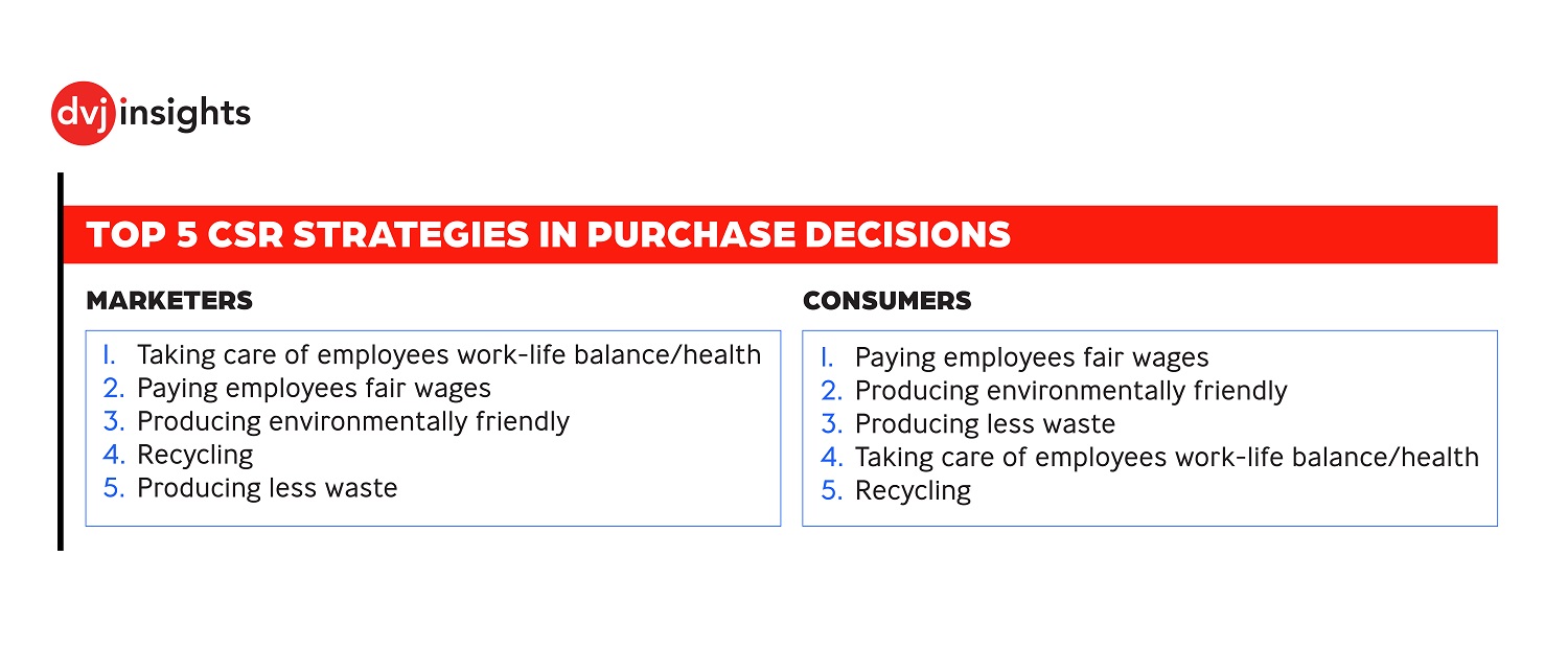 Voor 75% van de consumenten is het van groot belang dat het bedrijf waarbij zij producten aanschaffen MVO-activiteiten uitvoert. Consumenten in Europa vinden het betalen van eerlijke lonen, milieuvriendelijk produceren, minder afval produceren, zorgen voor evenwicht tussen werk en privéleven van de werknemers en recycling de meest belangrijke initiatieven. Daarentegen geven marketeers in heel Europa aan dat de zorg voor het evenwicht tussen werk en privéleven van werknemers, het betalen van eerlijke lonen aan werknemers, milieuvriendelijk produceren en recycling deel uitmaken van de MVO-strategie van hun bedrijf.