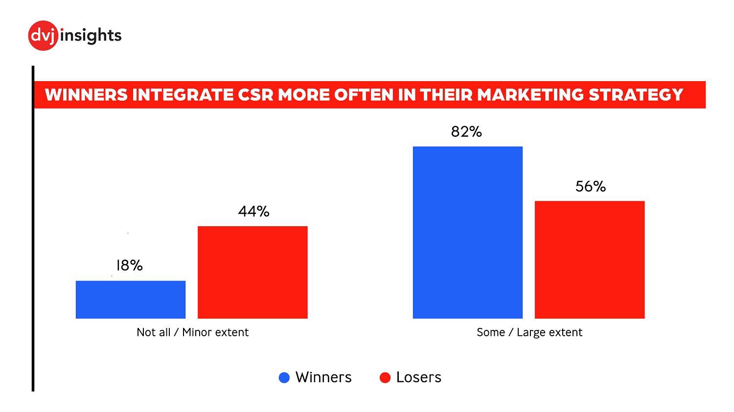 In totaal heeft 56% van de bedrijven hun MVO-strategie al gedefinieerd, en bovendien passen winnaars vaker MVO toe in hun marketingstrategie dan verliezers (65% versus 49%). Een andere bevinding is dat MVO-strategieën vaker voorkomen bij B2B-bedrijven (63%) dan bij B2C-bedrijven (51%). Het toenemende belang van MVO blijkt uit het feit dat 40% van de bedrijven tegenwoordig (veel) meer aandacht aan MVO besteedt dan twee jaar geleden, terwijl dit voor 42% van alle bedrijven onveranderd is gebleven.