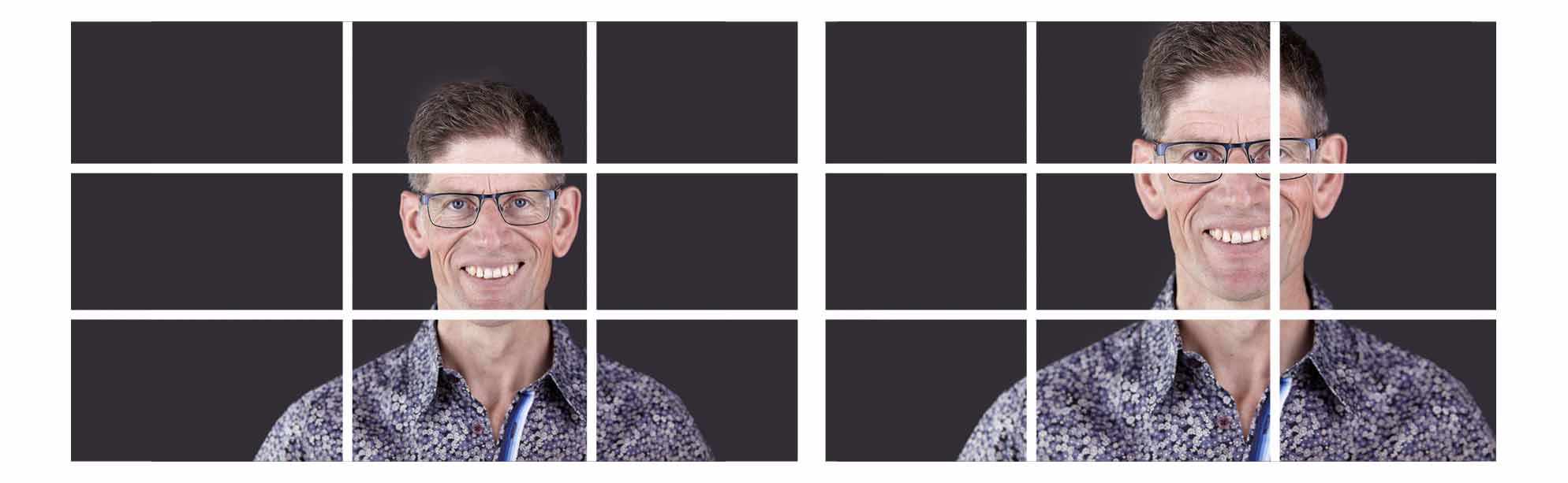 Door een juiste uitsnede te kiezen, zorg je ervoor dat je meteen contact maakt met de persoon die naar de foto kijkt. Als stelregel geldt dat we hiervoor het best de ‘regel van derden’ aanhouden, waarbij we zorgen dat de ogen op een derde van de foto komt te staan. De afbeelding hieronder illustreert wat hiermee wordt bedoeld.