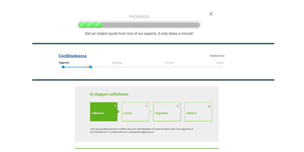 Of je nu wil dat de verkoop wordt afgerond, een account wordt aangemaakt óf een enquête geheel wordt ingevuld: laat zien hoe dicht mensen bij het voltooien van een doel zijn. Denk er daarbij ook aan om te laten zien hoeveel moeite mensen er al in hebben gestopt. Welke stappen zijn al wél doorlopen? Hoeveel procent van het formulier is al ingevuld?