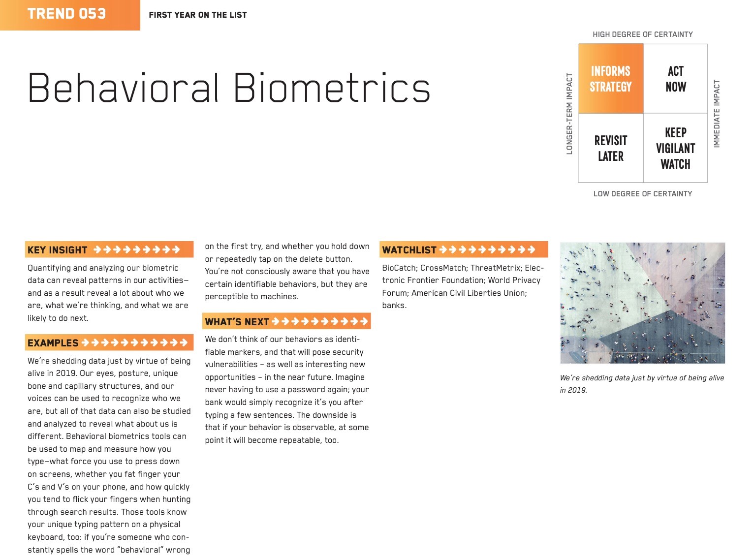 Afgelopen jaar is aanzienlijke vooruitgang geboekt op het gebied van gezichts-, gebaar- en stemtechnologie. Dit heeft nieuwe producten mogelijk gemaakt, zoals de Chinese Byton-auto die geen sleutel meer heeft. Emotie-herkenningssystemen helpen bestuurders woede of vermoeidheid de baas te worden om zo het veiligheidsniveau te verhogen. Praten is het nieuwe typen. En de smartphone wordt stilaan minder belangrijk. In 2019 bezit 40 procent van de Amerikaanse huishoudens een Smart Speaker en tegen 2020 gebruiken mensen hun stem voor de helft van alle zoekopdrachten. Wearables zoals slimme schoenen en slimme yogabroeken, zullen je bewegingen detecteren en registreren om deze te vergelijken met je standaardhouding om je te helpen beter te bewegen.
