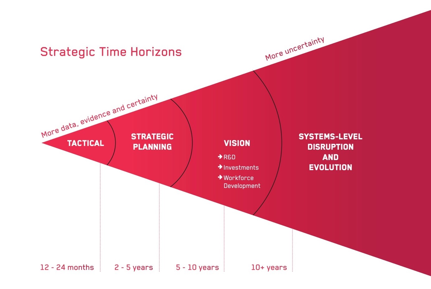 Om het hanteerbaar te maken, maakt FTI daarbij gebruik van een viertal tijd-horizons: van twaalf tot vierentwintig maanden (tactiek), twee tot vijf jaar (strategie), vijf tot tien jaar (visie) en meer dan tien jaar (disruptie en evolutie).