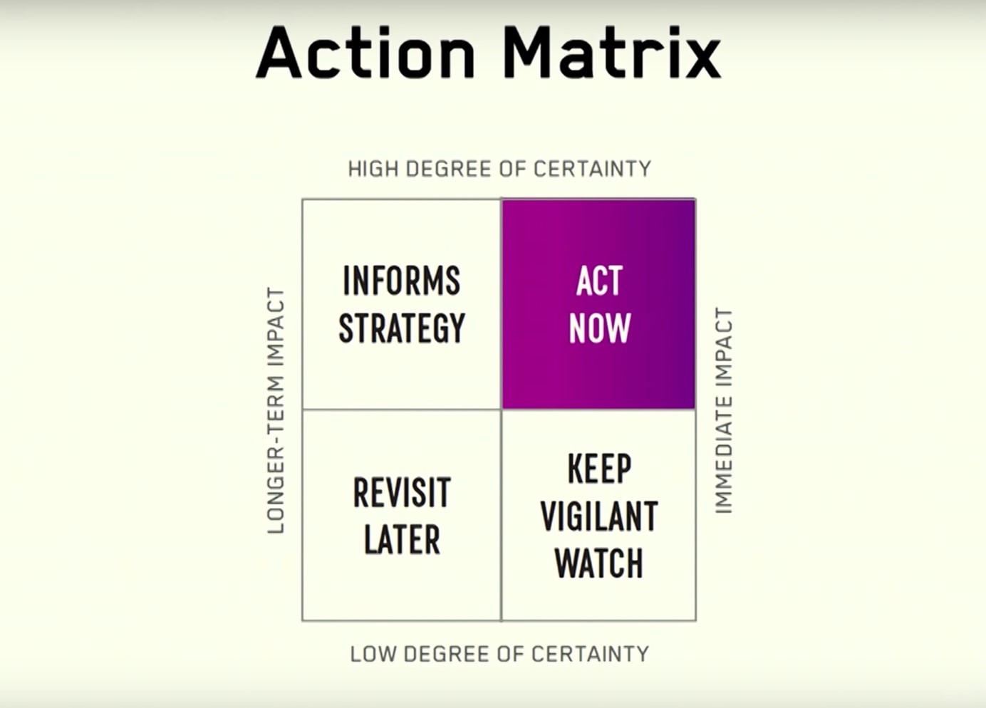 - Action Matrix: Een gemakkelijk af te lezen matrix die aangeeft waar de trend zich afspeelt. Het geeft aan of de trend moet worden gemonitord, je strategie moet worden geactualiseerd, de trend nog even niet relevant is, of directe actie nodig is.