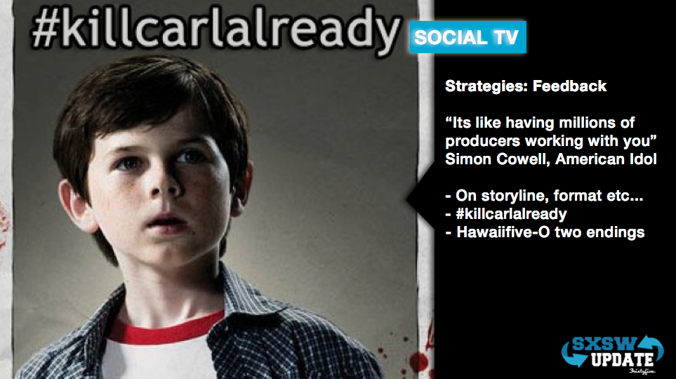 Zoals Simon Cowell van American Idol het zegt: “Its like having millions of producers working with you.” Feedback van de community kan doorslaggevend zijn voor een succesvol programma. Dat was bijvoorbeeld bij de serie Walking Dead ook het geval. In het tweede seizoen vonden mensen het karakter Carl vervelend en zeiden online continu “Kill Carl already“. Met deze feedback hebben de schrijvers Carl ook gehoorzamer gemaakt en minder storend voor de kijkers.