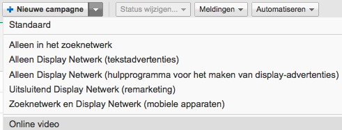 Om een nieuwe videocampagne te maken klik je, op campagneniveau, op het pijltje naast de button “Nieuwe campagne”. In het vervolgmenu kies je voor “Online video”.