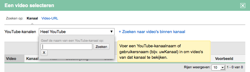 Bij het maken van een videoadvertentie kan je een koppeling tussen een YouTube-kanaal en je AdWords-account inzetten. Dit is echter niet noodzakelijk omdat je ook zonder koppeling video’s op kan zoeken en kan selecteren.