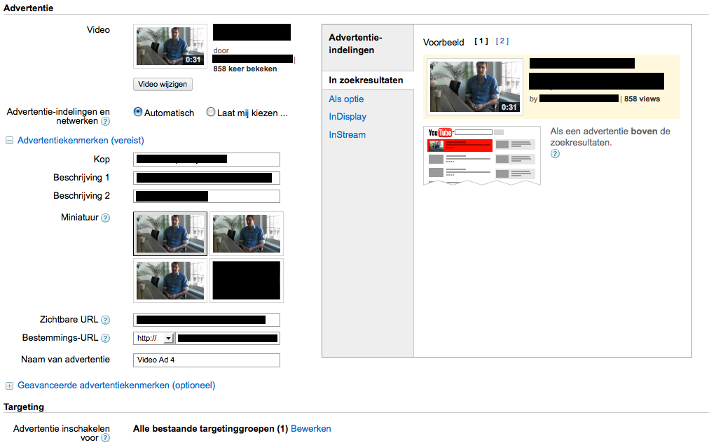Bij het maken van een videoadvertentie heb je als adverteerder eveneens de mogelijkheid om een doelgroep te targeten. Je hebt de mogelijkheid om op verschillende manier de gewenste doelgroep te targeten. Dit kan door middel van zoekwoorden op YouTube, zoekwoorden op het displaynetwerk, onderwerpen, demografische gegevens, interesses, remarketinglijsten en door middel van plaatsingen.