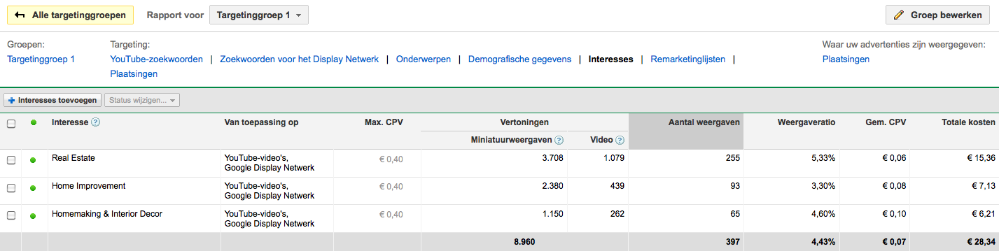 Onderstaand een voorbeeld van een videocampagne die als targeting drie interessegroepen heeft: