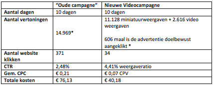 * Op het eerste gezicht lijkt het in bovenstaande tabel dat de oude campagne meer vertoningen heeft gegenereerd en dit klopt in de algemene zin van het woord ook. Hierbij moet echter wel rekening gehouden worden met het feit dat bij de oude campagne de advertenties automatisch weergegeven werden en bij de nieuwe campagne doelbewust op een miniatuurweergave of videoweergave geklikt dient te worden, voordat deze afspeelt. Dit duidt op een kwalitatief betere bezoekers.