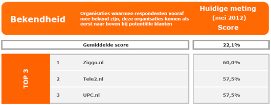 Zoals al blijkt uit onderstaande tabel, heeft UPC een online vindbaarheid van 77,5%. Ook dit is een hoog percentage en betekent een stijging ten opzichte van de 45% tijdens de vorige meting, in november 2011. Op de websitespecifieke onderdelen scoort UPC eigenlijk heel constant, tussen de 6 en 7, zonder uitschieters naar boven of beneden. Aan het eind van de rit houdt UPC 12,5% van de respondenten over. Dit aandeel is gelijk aan dat van zes maanden eerder. Een zeer opvallend verschil met de voorkeur voor Tele2, is dat de respondenten die voor UPC kiezen juist in dezelfde extreme mate het argument van bekend- en betrouwbaarheid aanvoeren.